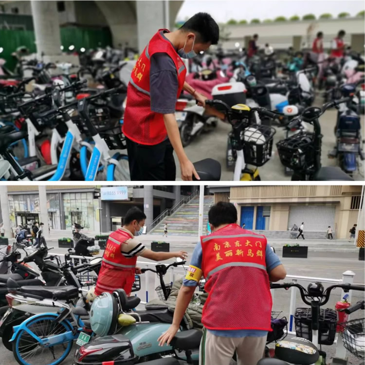 另一邊,元帥班和初心班的男干部也不甘示弱。面對(duì)停放雜亂的電動(dòng)車(chē),他們互相配合,合作整理,并引導(dǎo)正在停車(chē)的車(chē)主有序停放。原本略顯雜亂的停車(chē)區(qū)很快變得井井有條起來(lái)。