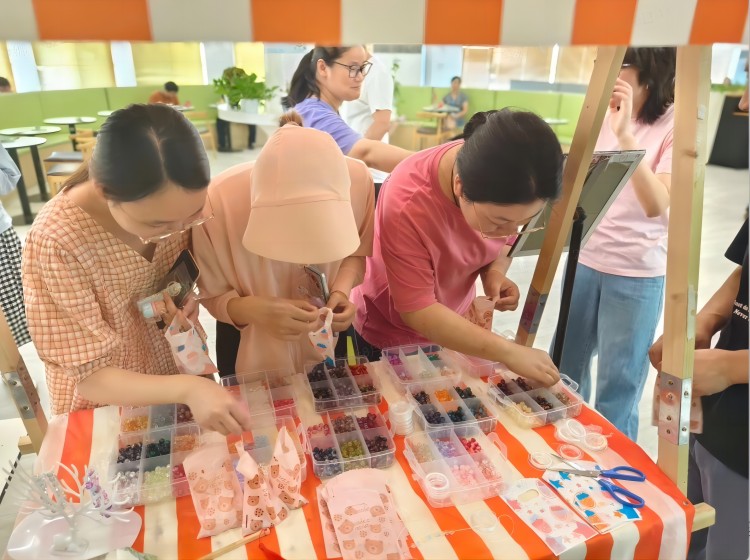 彩珠斑斕,猶如繁星點(diǎn)點(diǎn),在場(chǎng)的海陵員工精心挑選了自己心儀的珠子,以靈巧的雙手,將這些絢爛的彩珠編織成一條條獨(dú)一無(wú)二的手鏈。