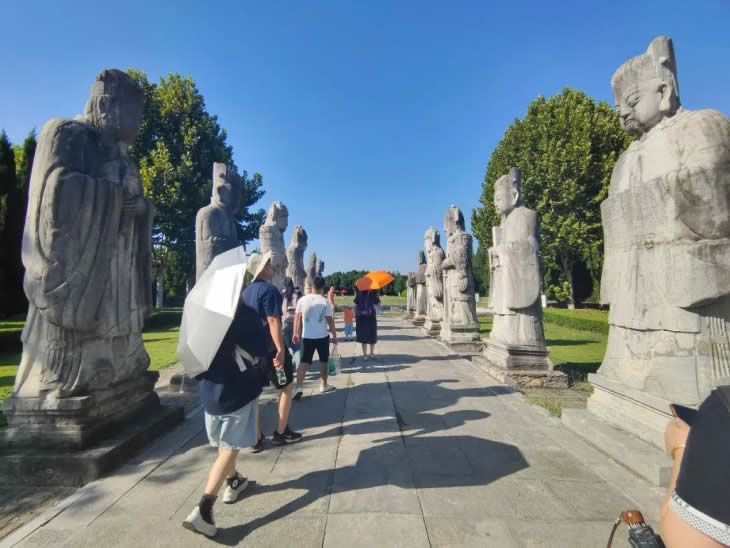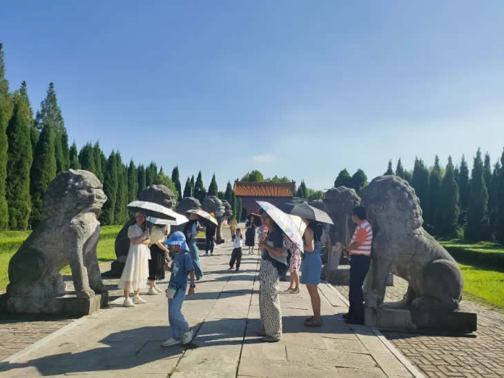 中午,大家在農(nóng)家樂(lè)品嘗了當(dāng)?shù)靥厣↓埼r,隨后坐車前往第二站明祖陵。這里被譽(yù)為全國(guó)唯一一座水下皇陵,承載了朱明興衰的塵煙。工匠與家屬們漫步在陵墓神道之上,在講解聲中觀察幾百年前的石刻群像,體會(huì)其中的歷史余韻與時(shí)代遺音。石像歷經(jīng)幾百年時(shí)光仍然細(xì)節(jié)豐富、栩栩如生,然而六朝舊事隨流水,百年帝業(yè)亦成空。