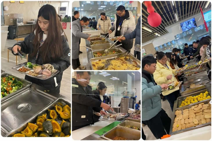 菜名吉利、美味豐盛的各色美食次序排開。大家一時難以抉擇,紛紛表示“我全都要”。餐盤中,海鮮肉食、清爽鮮蔬、精美糕點、甜蜜水果很快摞起一座高高的小山?!靶虏松峡?!”司務長一聲吆喝,又引得無數(shù)圍觀,好不熱鬧。