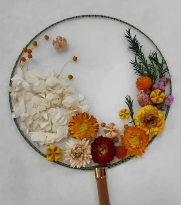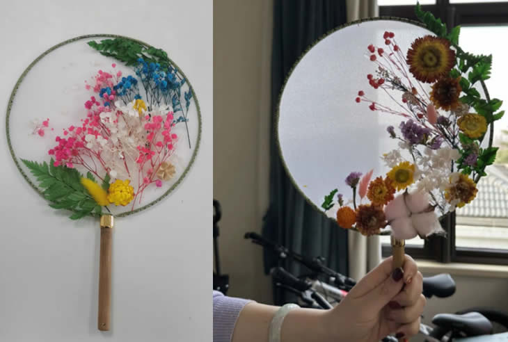 手中白團(tuán)扇。凈如秋團(tuán)月。永生花落座于團(tuán)扇,美在其形,美在其韻,希望“女神”們能與這幅團(tuán)扇一樣美在其心,美在其魂。